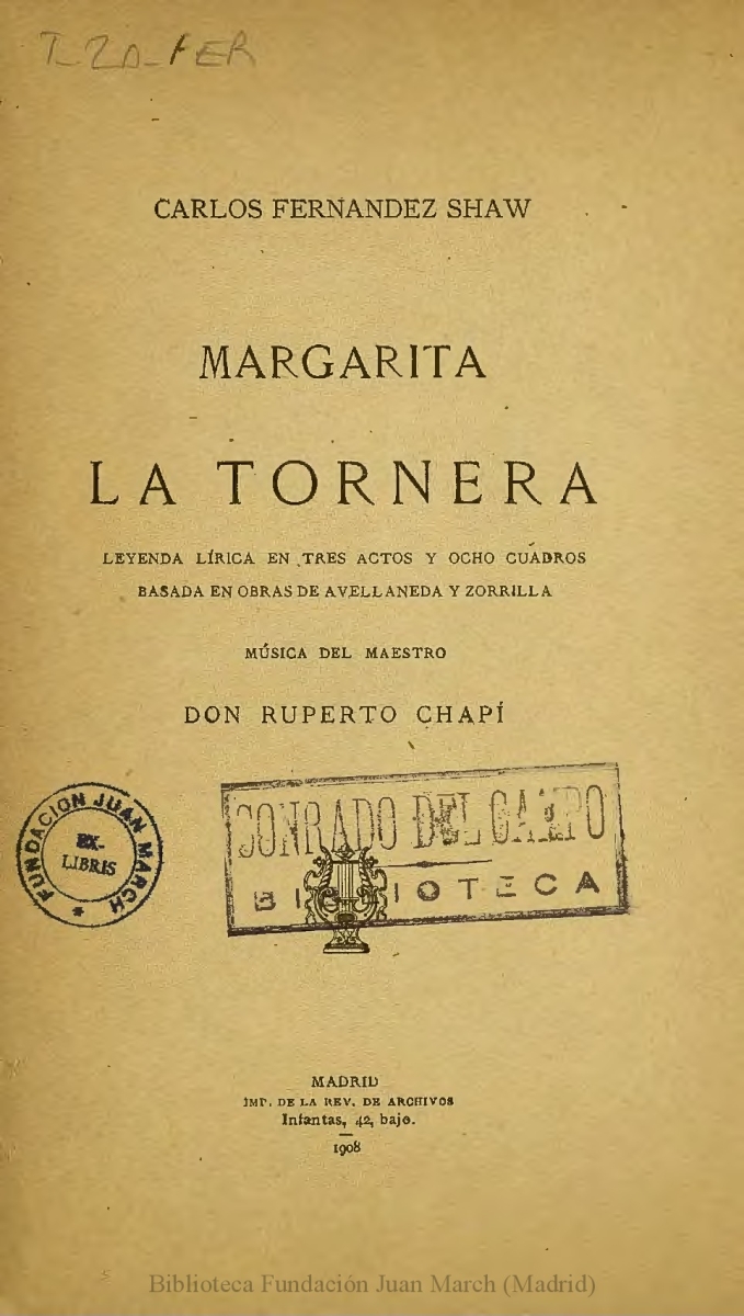 Nº de personajes: 8 et al. (5 h. y 3 m.); Dedicatoria autógrafa del autor del libreto, Carlos Fernández Shaw, al compositor Conrado del Campo, fechada el 9 de marzo de 1909.; Estreno: Teatro Real (Madrid), 24 de febrero de 1909.; Registro y sello de la Biblioteca Conrado del Campo en uno de los ejemplares.