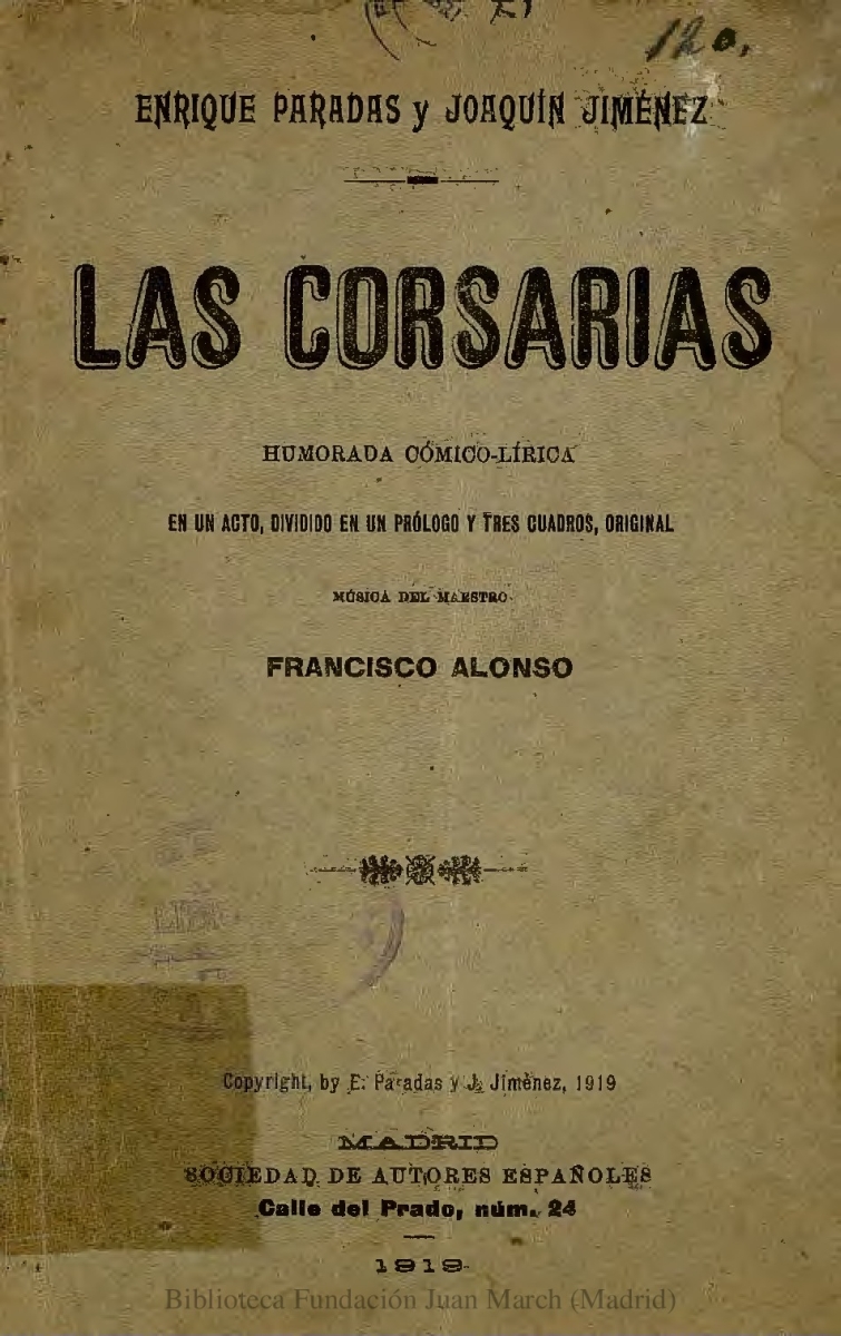 - Título: Las corsarias:humorada cómico-lírica en un acto, dividido en un prólogo y tres cuadros
