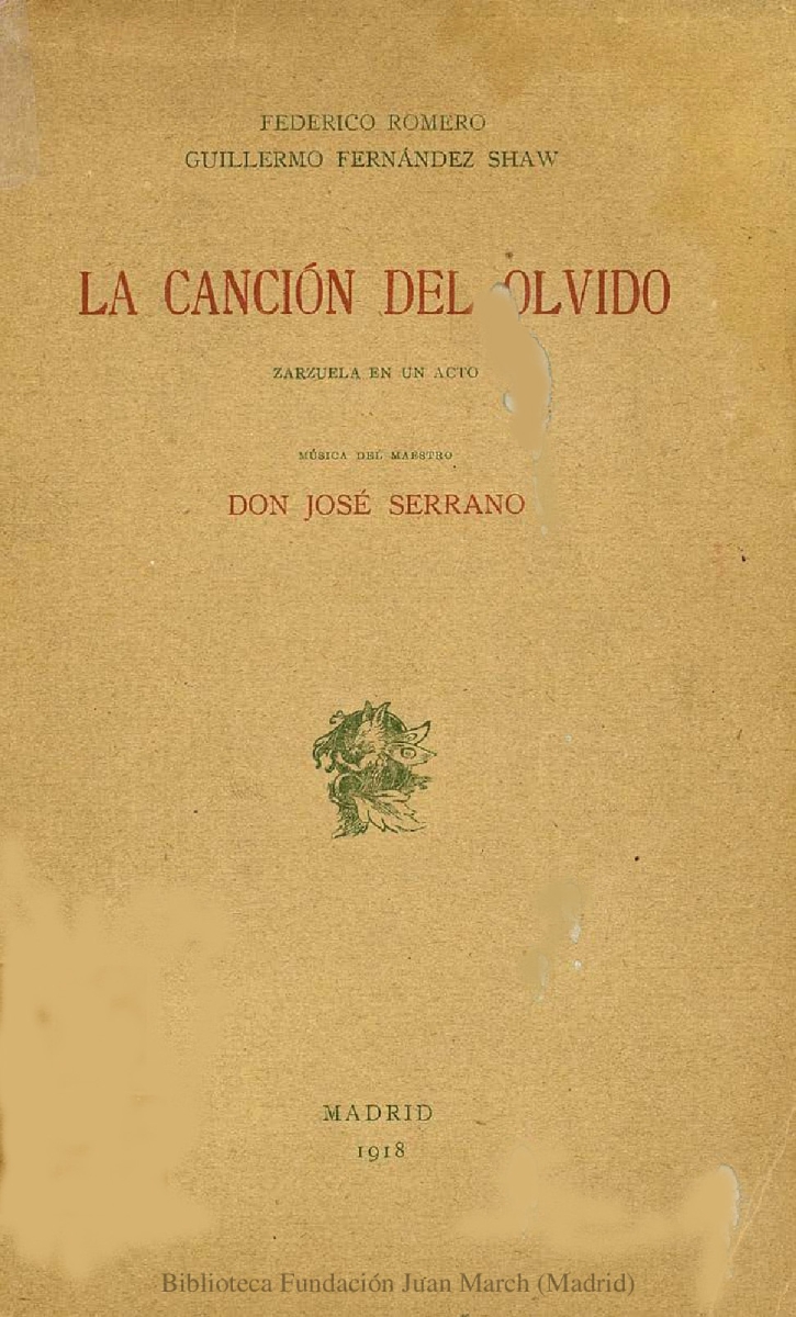 - Título: La canción del olvido:zarzuela en un acto dividido en cuatro cuadros, en verso y prosa