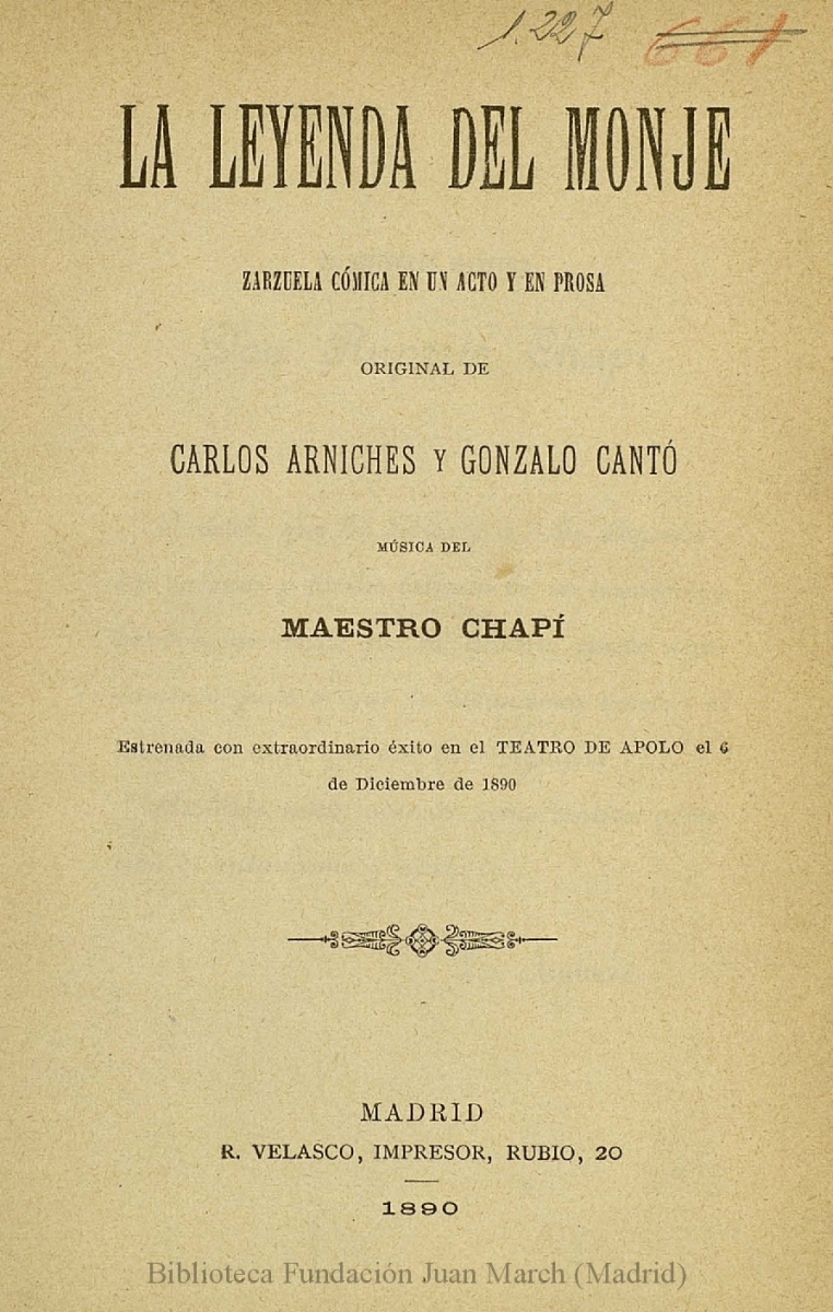 - Título: La leyenda del monje:zarzuela cómica en un acto y en prosa