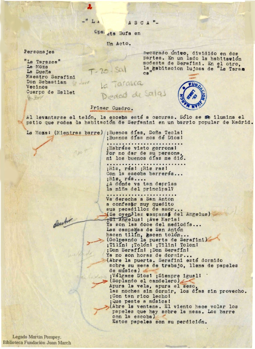 - Nota: Nº personajes: 5 et al. (2 h. y 3 m.); Ejemplar mecanografiado con anotaciones manuscritas.; Incluye fotocopia más legible del mismo ejemplar.; Mención de responsabilidad tomada de fuentes externas al documento.; Legado Ángel Martín Pompey.; Estreno: Teatro de Madrid, 20 de noviembre de 1998.