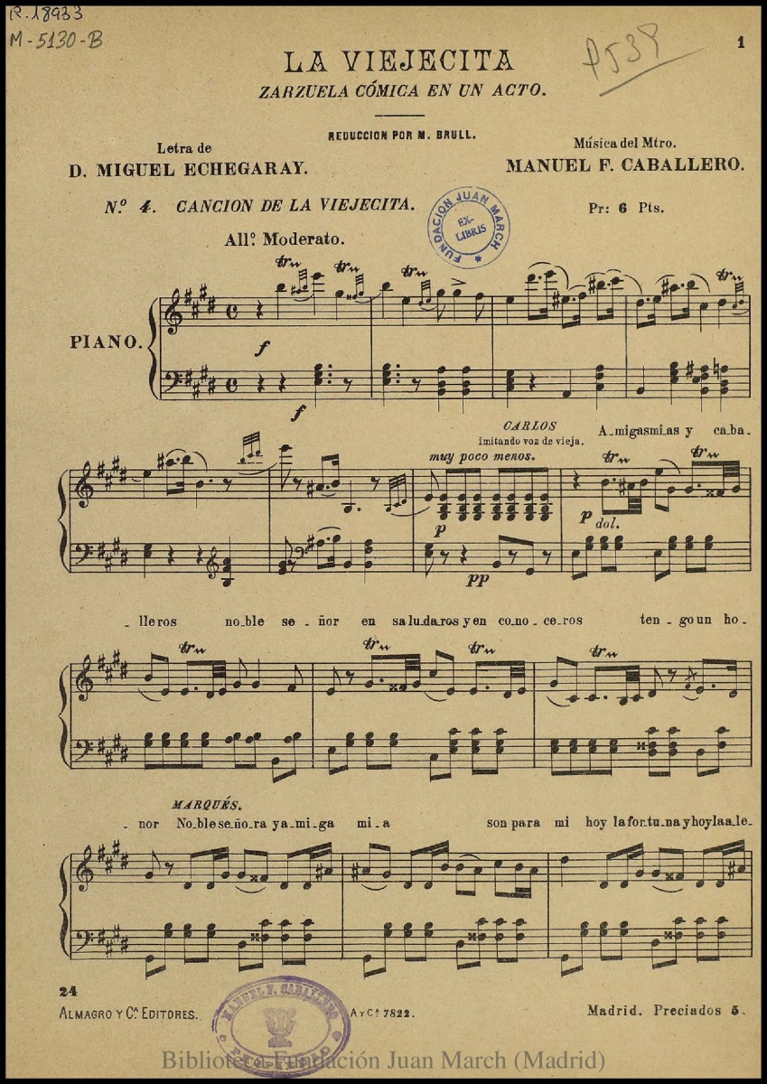 - Nota: Música para solistas y piano.; Estreno: Teatro de la Zarzuela (Madrid), 29 de abril de 1897.; La reducción para piano incluye el texto de la canción (sin sistema); En p. 7, firma del calcógrafo: "F. de Echevarría"