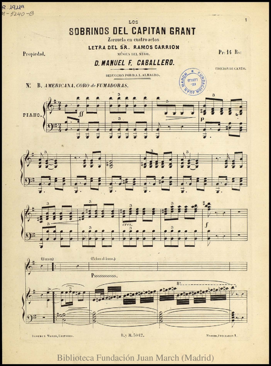 - Título: Los sobrinos del Capitán Grant:zarzuela en cuatro actos : Nº B, Americana : Coro de fumadoras