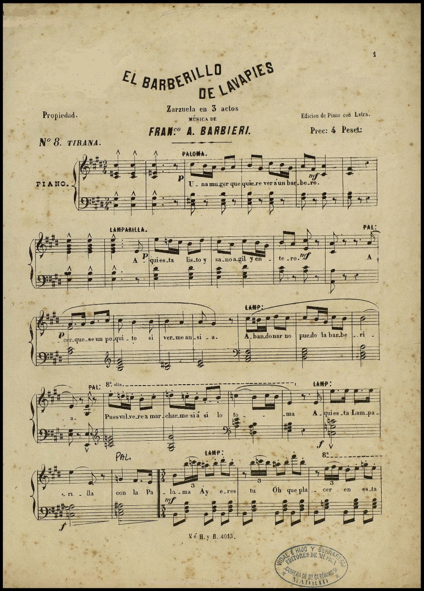 Música para soprano, tenor y piano.; Estreno: Teatro de la Zarzuela (Madrid), 18 de diciembre de 1874.; Fecha de publicación tomada de La música en el Boletín de la Propiedad Intelectual, Biblioteca Nacional, 1997.; Sello: "Vidal e hijo y Bernareggi. Editores de música. Carrera de S. Gerónimo. Madrid"