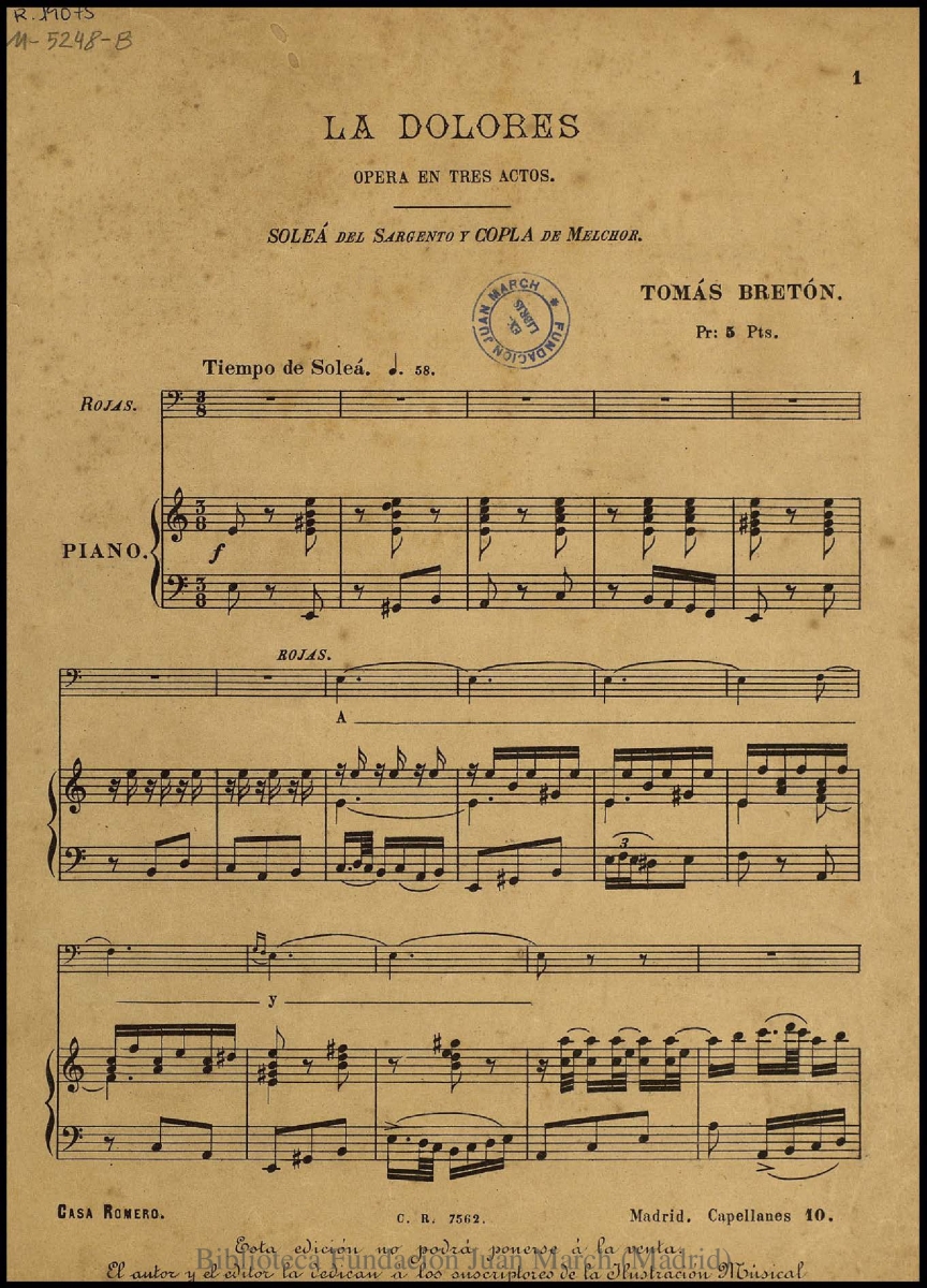 - Título: La Dolores:Soleá del sargento y Copla de Melchor : ópera en tres actos