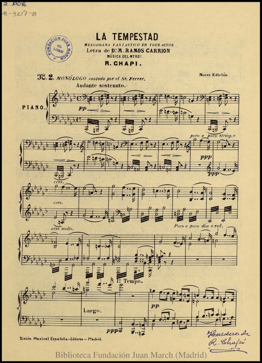 - Materias: Canciones (Barítono) con piano - Partituras vocales; Zarzuelas - Fragmentos - Partituras vocales con piano; Zarzuelas; Teatro lírico