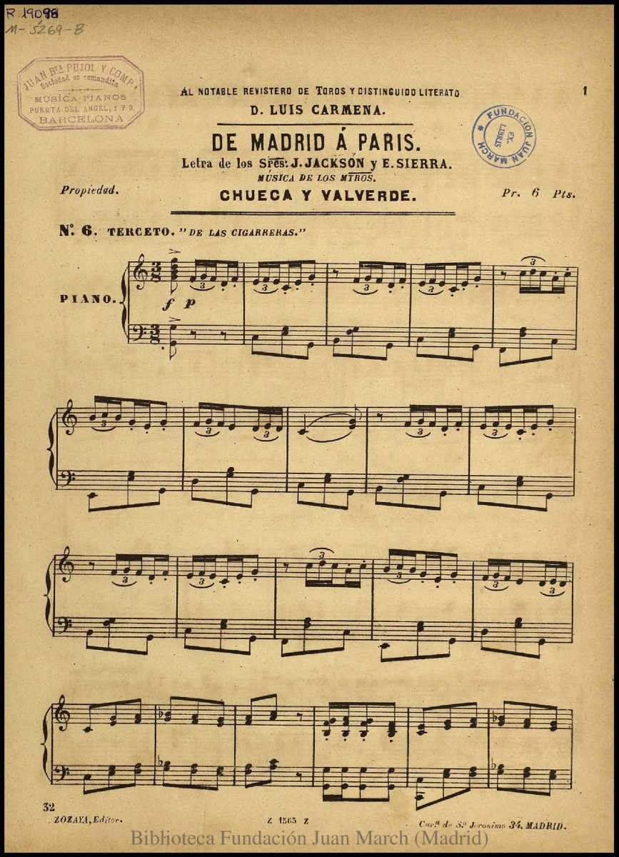 Música para tres voces y piano.; Estreno: Teatro Felipe (Madrid), 12 de julio de 1889.; En la cabecera, dedicatoria: "Al notable revistero de Toros y distinguido literario D. Luis Carmena"; Fecha tomada de: C. J. Gosálvez, "La edición musical española hasta 1936"; Sello de la casa de venta: "Juan Bra. Pujol y Compa. Sociedad en comandita. Música y pianos. [...] Barcelona"