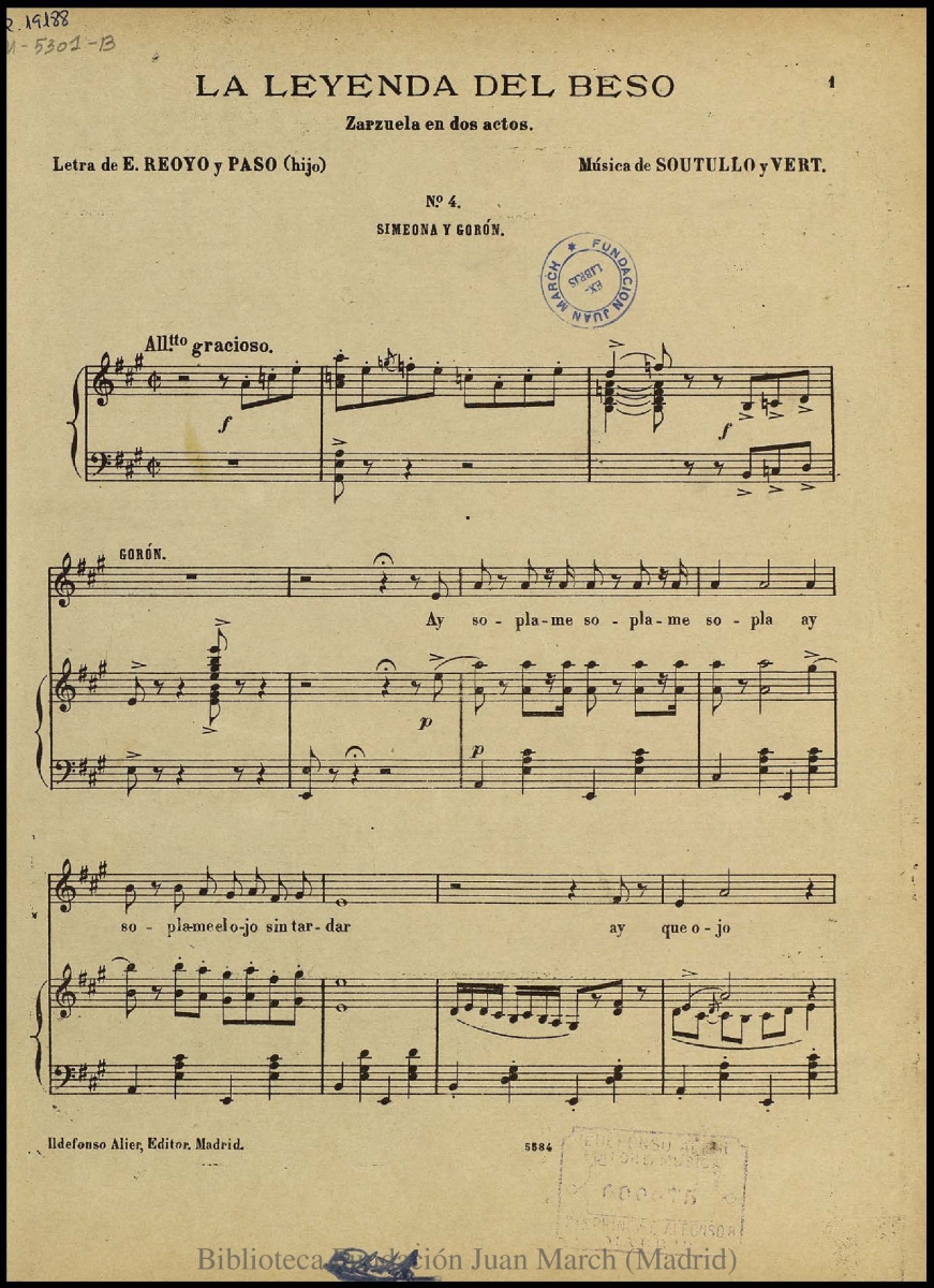 - Materias: Dúos vocales con piano - Partituras vocales; Zarzuelas - Fragmentos - Partituras vocales con piano; Zarzuelas; Teatro lírico