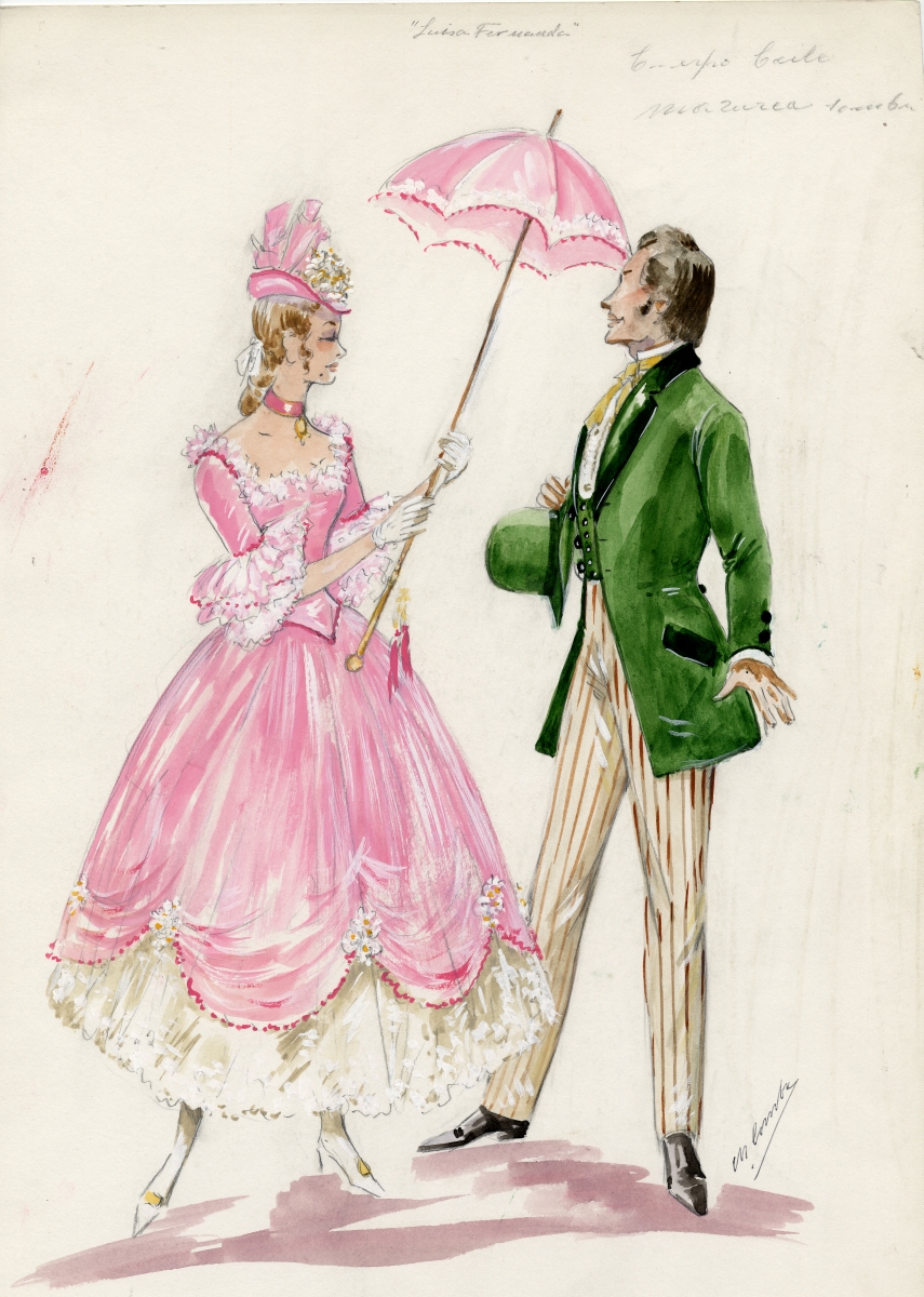 Nota: Boceto original del cuerpo de baile para la "Mazurca de la sombrilla", firmado por el autor.; Mención de responsabilidad creada a partir del contenido del documento.; La obra fue estrenada en el Teatro Calderón (Madrid), el 26 de marzo de 1932.