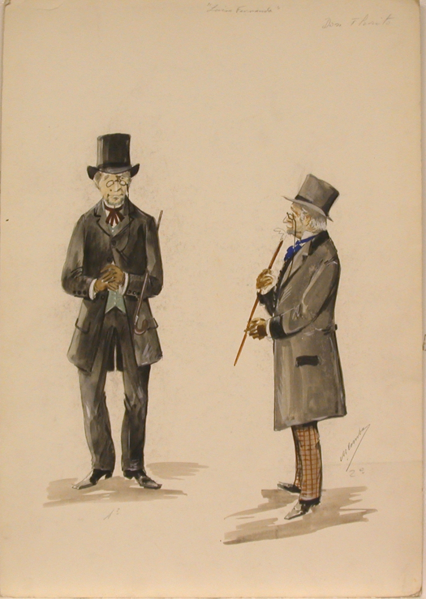Nota: Boceto original del personaje de "Don Florito", de frente y de perfil, firmado por el autor.; Mención de responsabilidad creada a partir del contenido del documento.; La obra fue estrenada en el Teatro Calderón (Madrid), el 26 de marzo de 1932.