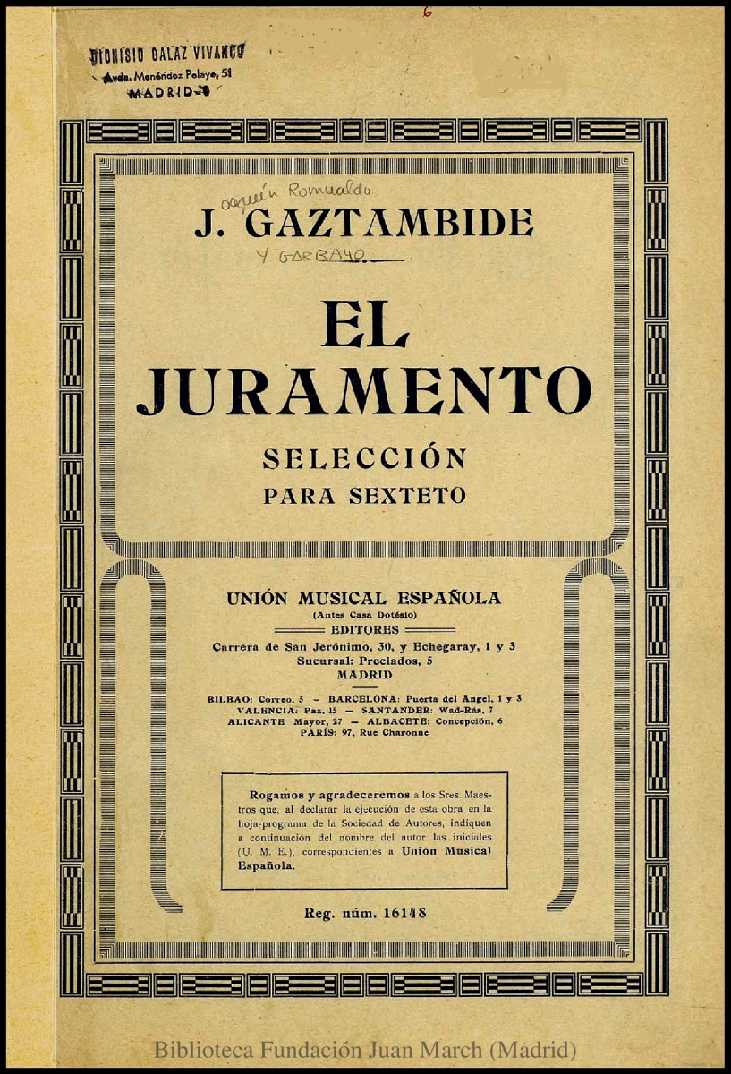 - Nota: Música para piano, 2 violines, viola, violonchelo, contrabajo.; Estreno: Teatro de la Zarzuela (Madrid), 20 de diciembre de 1858.; Fecha de publicación basada en el Archivo histórico de la Unión Musical Española, SGAE, 2000.; Partes: Piano, Violín I, Violín II, Viola, Violoncello, Contrabajo.