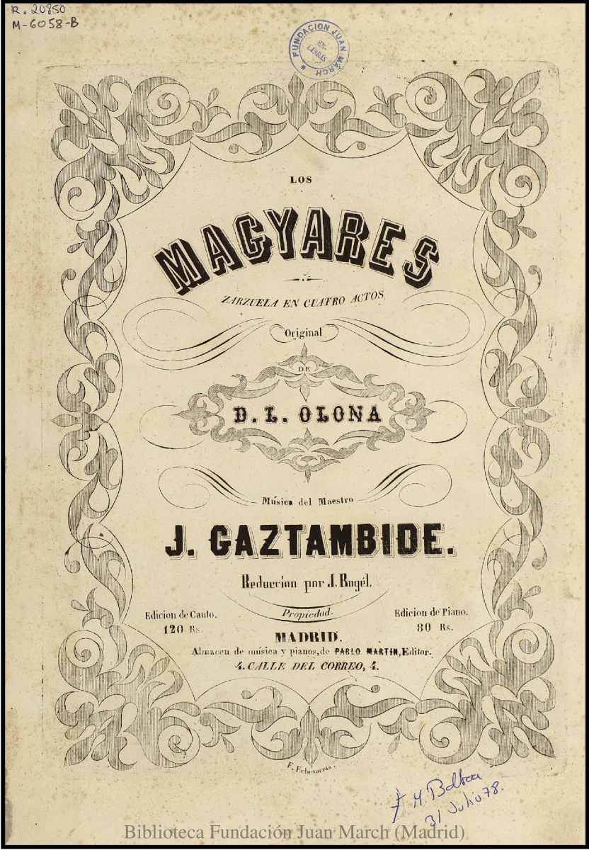 - Nota: Música para piano.; Estreno: Teatro de la Zarzuela (Madrid), 12 de abril de 1857.; Fecha tomada de C. J. Gosálvez, La edición musical española hasta 1936.; Incluye el índice.