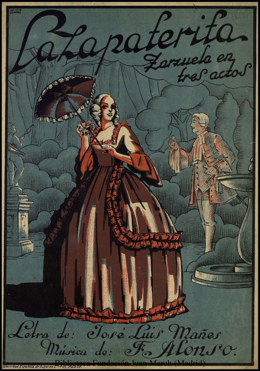 - Nota: Música para voz y piano.; En la cabecera, dedicatoria del compositor.; Estreno: Teatro Calderón (Madrid), 12 de abril de 1941.; Cubierta ilustrada con motivos de la zarzuela. A color y firmada por Julio Giménez.