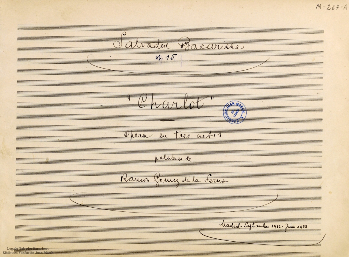 - Nota: Música para solistas, coro y reducción orquestal.; Partitura autógrafa.; Incluye dos páginas sueltas del acto 1º.; Para consultar otras versiones de la misma obra: Charlot.
