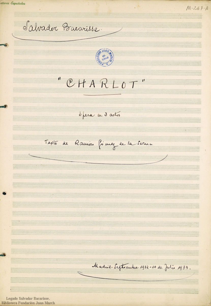 Partitura autógrafa.; Plantilla: Voces solistas, coro -- 3[1.2.picc] 3[1.2.cingl] 3[1.2.clb] 3[1.2.cfag] -- 4 3 3 1 -- timb + 1perc, arp, p -- cuerdas. Instrumentos de percusión: bombo, platos, tambor, triángulo.; Legado Salvador Bacarisse.; Reparto: Margarita (S), La Estrella (S), Estrella 2ª (S), Estrella 3ª (S), 4 divorciadas de Charlot (2 S, 2 Mezzo), Charlot (Mimo), El Bis de Charlot (T), El falso Charlot (T), El Burgués (Bar), El Padre (B), Galán 1º (Bar), Galán 2º (T), Un guardia - un policía (B), Coro de admiradoras de Charlot, Coro de Angelitos, Gentes del Cine, Cuerpo de Baile.; En la portada, margen inferior, lugar y fecha de composición: "Madrid. Septiembre 1932 - 10 de julio 1933"
