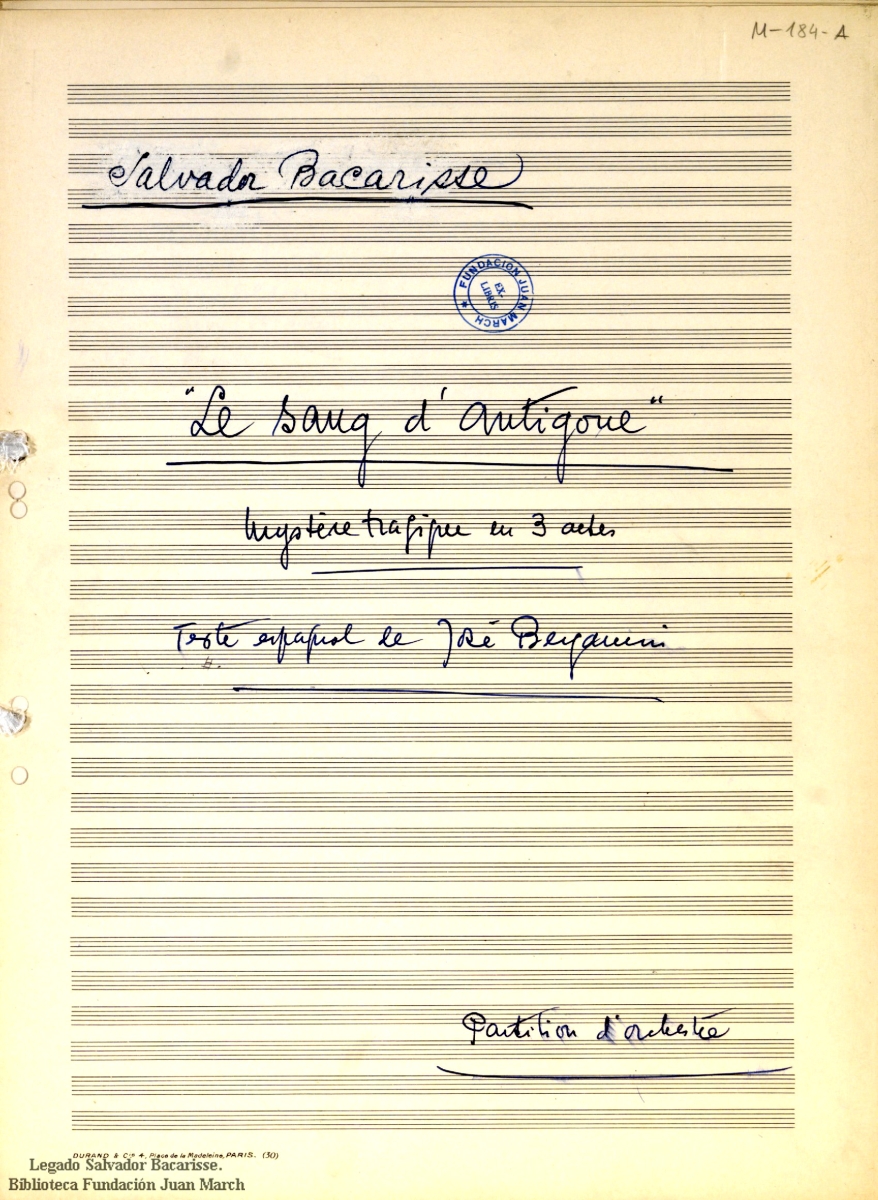 Plantilla: Vocs. sols., Coro I (SSAATTBB), Coro II (SATB) -- 3[1.2.picc] 3[1.2.cingl] 3[1.2.clb] 3[1.2.cfag] -- 4 3 3 1 -- timb + perc, arp, p -- cuerdas.; Reparto de personajes hablados: Antígona; Ismena; El mensajero; Dos corifeos; Dos soldados; Creón.; Reparto de personajes cantados: Ismena (S); Eurídice (Mezz-S); El lazarillo (S); Creón (Bar); Hemon (T); Tiresias (B); La sombra de Poliniac (T); La sombra de Eteodes (Bar); 3 voces mascaradas (Coro I); La madre (S); La cortesana (S); La viuda (Mezz-S); La esclava (Mezz-S); El caballero (T); El mercader (T); El esclavo (B); El mendigo (B); Texto en español.; Legado Salvador Bacarisse.