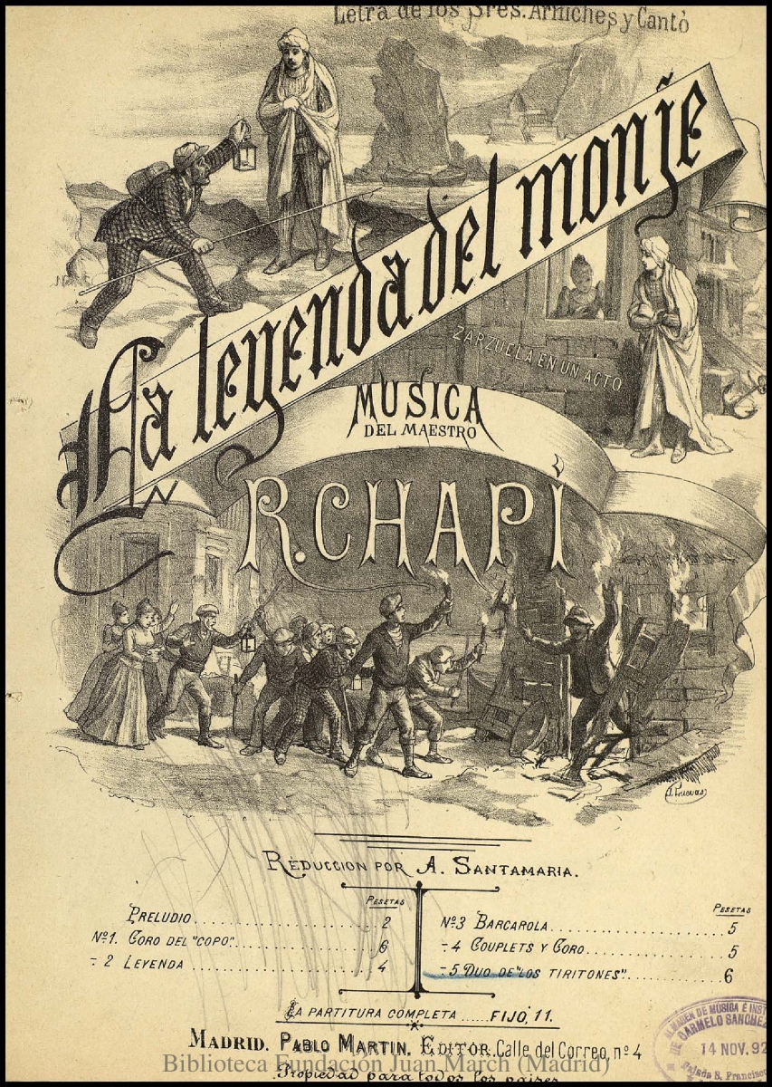 - Nota: Música para dúo vocal y piano.; Estreno: Teatro de Apolo (Madrid), 6 de diciembre de 1890.; Fecha tomada de: C. J. Gosálvez, "La edición musical española hasta 1936"; Cubierta litografiada con motivos de la zarzuela. Firmada: "J. Cuevas"