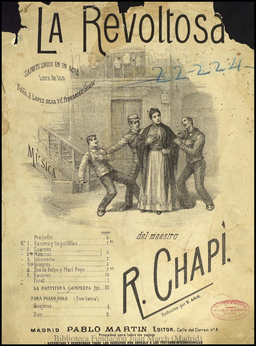 Alcance y contenido: Preludio -- N. 1. Escena y seguidillas -- N. 2. Cuarteto y mutación -- N. 3. Intermedio -- N. 3Bis. Guajiras -- N. 4. Dúo de Felipe y Mari-Pepa -- N. 5. Escenas -- Final