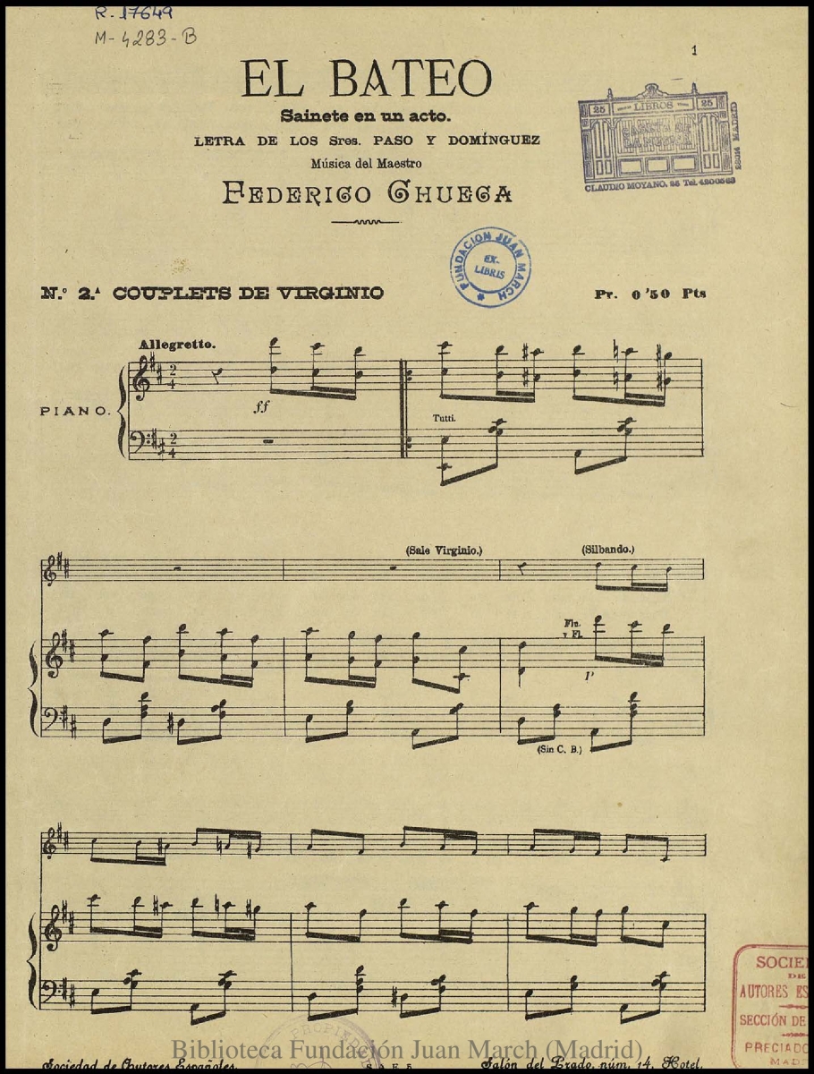 - Materias: Zarzuelas - Fragmentos - Partituras vocales con piano; Canciones (Tenor) con piano - Partituras vocales; Zarzuelas; Teatro lírico; Coros (Voces al unísono) con piano - Partituras vocales