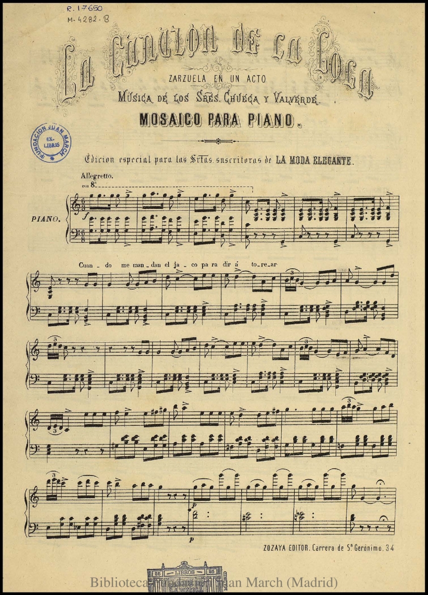 - Nota: Música para piano.; Estreno: Teatro de la Alhambra (Madrid), 25 de mayo de 1880.; En la cabecera: "Edición especial para las Srtas. suscri[p]toras de La moda elegante"; En p. 4, lugar y fecha: "Madrid, 20 de junio de 1880"