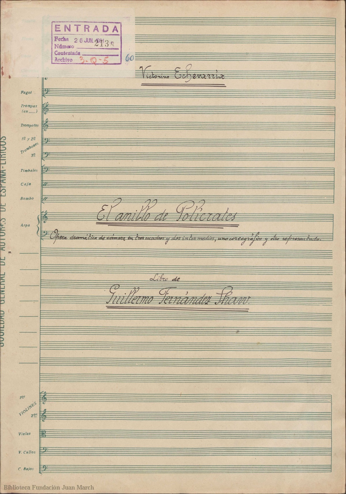 Autógrafo musical.; Plantilla: voc. sols -- 2 2 2 2 -- 2 2 3 0 -- timb + 2 perc, arp -- cuerda.; Personajes: Lya (S), Frígia (A), Polícrates (Bar), Menandro (B), Alcinos (T), Un pescador (T), Un vigía (T), Un pastor (T), Dos guardias, Danzarina 1ª, Danzarina 2ª, Danzarines (8); En f. 162r, lugar, fecha y firma del compositor: "Madrid, junio 1961, V. Echevarría"; Partitura guardada en carpeta. Con etiqueta en la tapa anterior: "V. Echevarría. El anillo de Polícrates. Ópera de cámara en un acto. Fundación March. Pensión de Música 1960"; Reproducción no permitida, salvo autorización expresa del autor o sus herederos.; En f. 1r, etiqueta de archivo: "26 jun 1961. N: 2138. 3-Q-5"; Memoria final de beca de la Fundación Juan March.