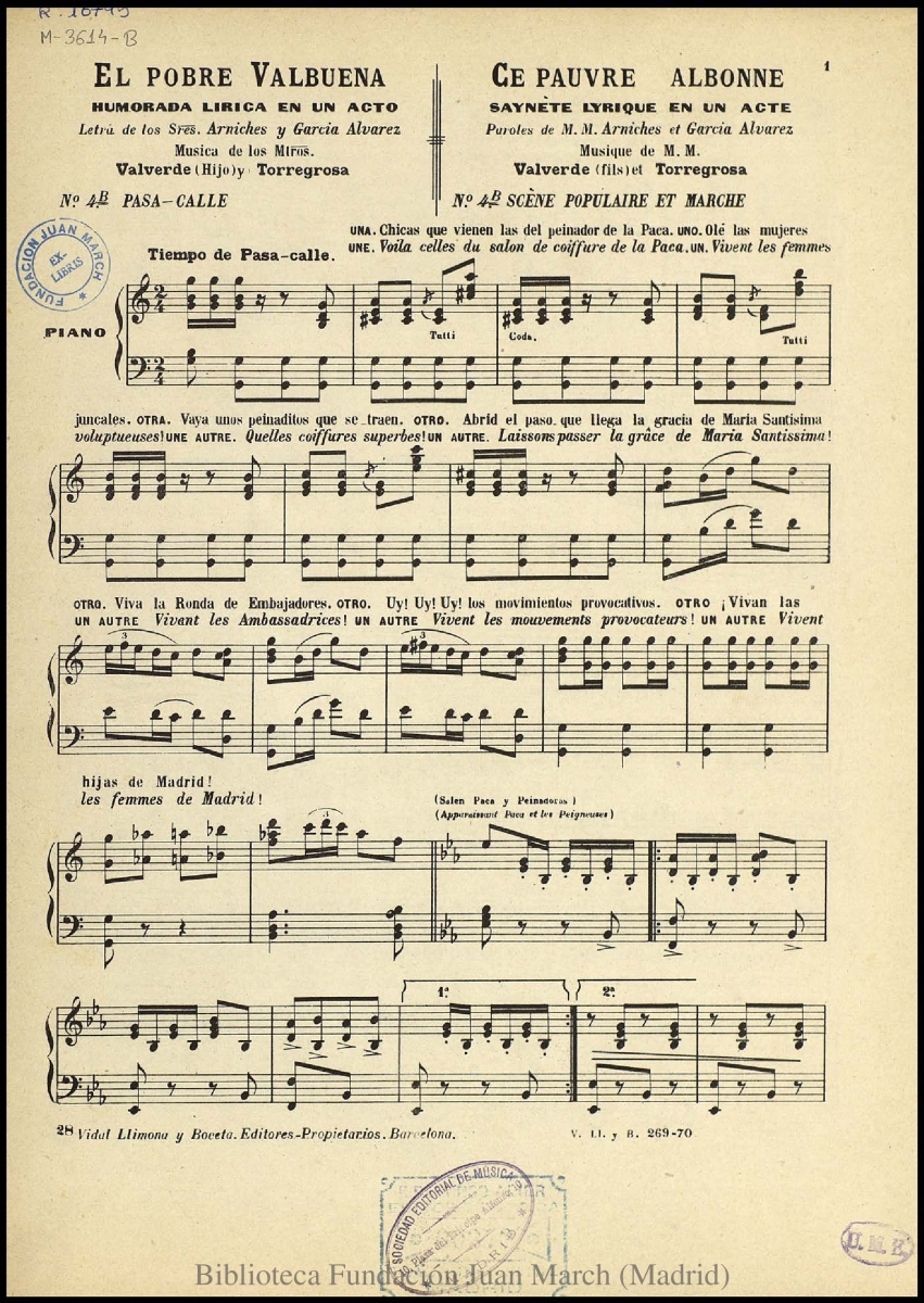 - Nota: Música para voz solista, coro femenino y piano.; Texto en francés y español.; Estreno: Teatro de Apolo (Madrid), 1 de julio de 1904.; Fragmento de la zarzuela en un acto "El pobre Valbuena". Corresponde al N. 4 B, Pasacalle.