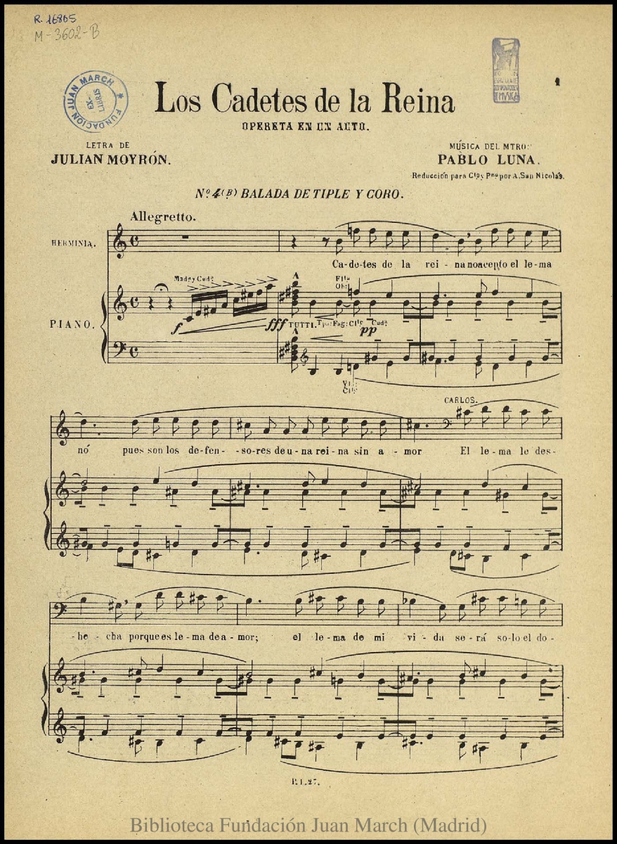 - Título: Los cadetes de la Reina:N. 4 B, Balada de tiple y coro : opereta en un acto