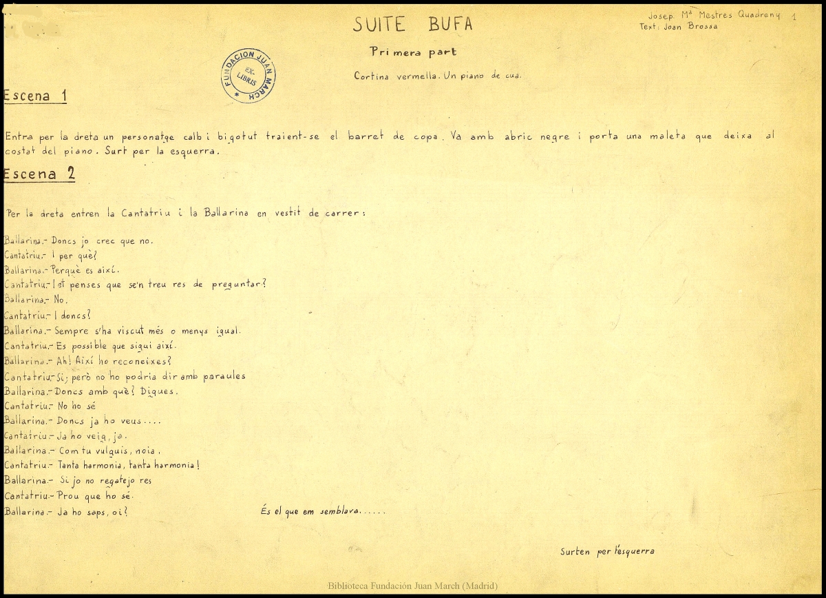 Primera part. Escena 1 : [texto] ; Escena 2 : [diálogo] ; Escena 3 : [notación musical para piano] ; Escena 4 : [notación musical para piano] ; Escena 5 : [notación musical para piano] ; Escena 6 : [notación musical para piano] ; Escena 7 : [diálogo] ; Escena 8 : [notación musical gráfica] -- Segona part. Escena 1 : [partitura de evento] ; Escena 2 : [notación musical para piano y partitura de evento] ; Escena 3 : [notación musical para piano y partitura de evento] ; Escena 4 : [notación musical para piano y partitura de evento] ; Escena 5 : [notación musical para piano] ; Escena 6 : [notación musical gráfica] ; Escena 7 : [notación musical para piano y partitura de evento] ; Escena 8 : [notación musical para piano y partitura de evento] ; Escena 9 : [notación musical para piano y partitura de evento]