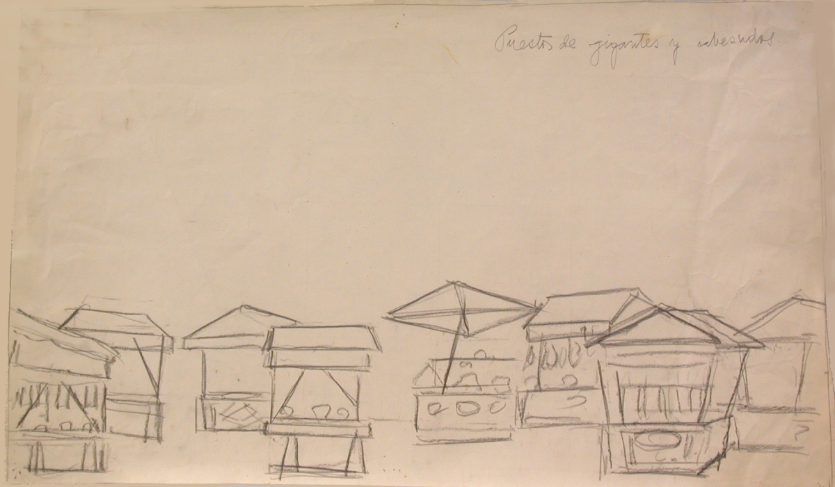 Nota: Boceto original.; Mención de responsabilidad creada a partir del contenido del documento.; La obra fue estrenada en el Teatro de la Zarzuela (Madrid), el 29 de noviembre de 1898.; En el margen superior derecho: "Puestos de gigantes y cabezudos"