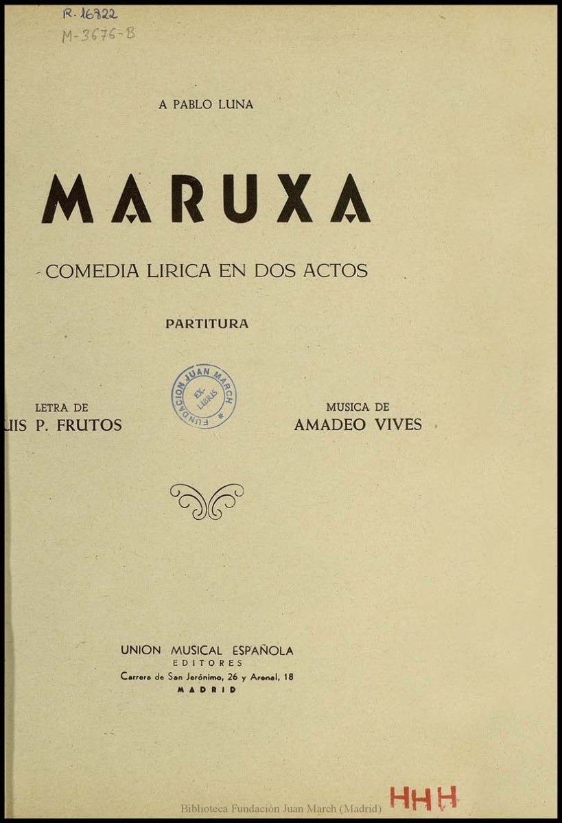 Nota: Música para voces solistas, coro y piano.; Estreno: Teatro de la Zarzuela (Madrid), 28 de mayo de 1914.; Reparto: Maruxa (S), Pablo (Ba), Rosa (S), Antonio (T), Rufo (B), Eulalia (A), Un zagal (Ba); En la portada, dedicatoria: "A Pablo Luna"