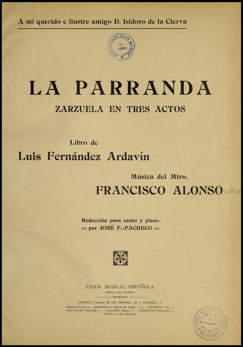 Materias: Zarzuelas - Partituras vocales con piano; Zarzuelas; Teatro lírico