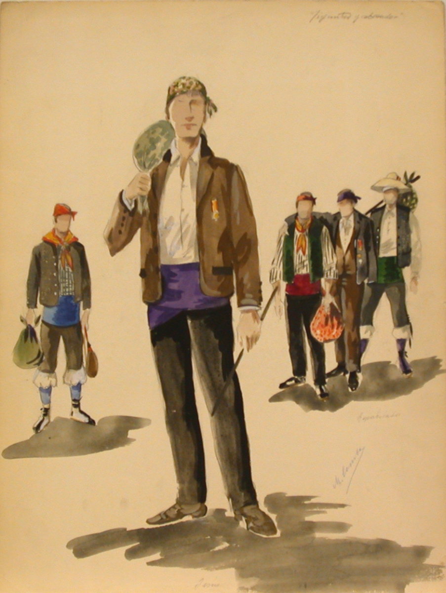 Nota: Boceto original de los personajes "Jesús" y "Repatriados" firmado por el autor.; Mención de responsabilidad creada a partir del contenido del documento.; La obra fue estrenada en el Teatro de la Zarzuela (Madrid), el 29 de noviembre de 1898.