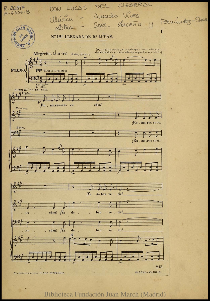 - Nota: Música para voces solistas, coro y piano.; Estreno: Teatro de Parish (Madrid), 18 de febrero de 1899.; La reducción del piano es apuntada, con la indicación de la entrada de los instrumentos.; En p. 22, indicación del nombre del calcógrafo: "A. Ruiz"