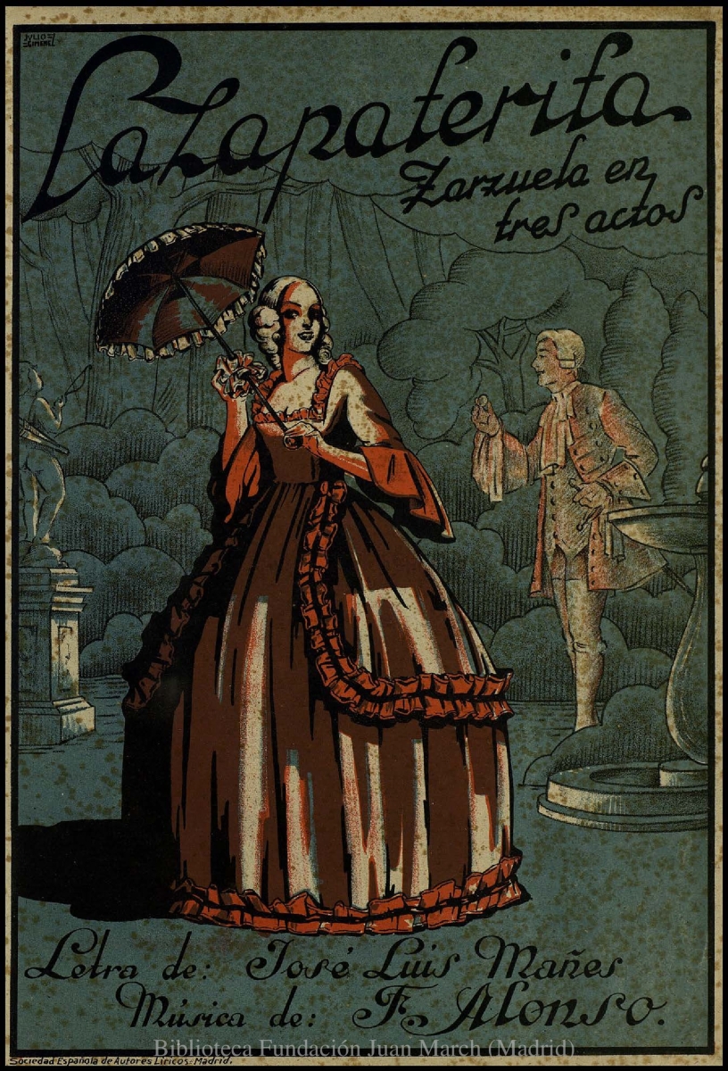 - Nota: Música para voz, coro y piano.; Estreno: Teatro Calderón (Madrid), 12 de abril de 1941.; Cubierta ilustrada con motivos de la zarzuela. A color y firmada por Julio Giménez.