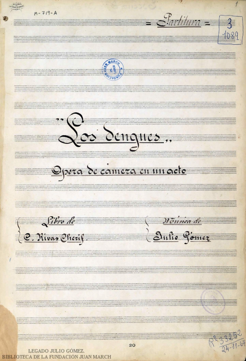 Plantilla: Voces solistas -- 1 1 1 1 -- 2 1 0 0 -- timb + 1 perc, p, cuerda.; Partitura autógrafa.; En la última página, firma y fecha: "23 de octubre de 1927"; Ejemplar encuadernado en holandesa con núm. de registro, núm. de signatura y sellos de la Biblioteca del Conservatorio de Madrid.; Legado julio Gómez.
