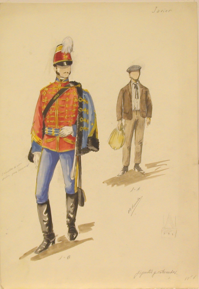 Nota: Boceto original del personaje de "Javier" firmado por el autor.; Mención de responsabilidad creada a partir del contenido del documento.; La obra fue estrenada en el Teatro de la Zarzuela (Madrid), el 29 de noviembre de 1898.