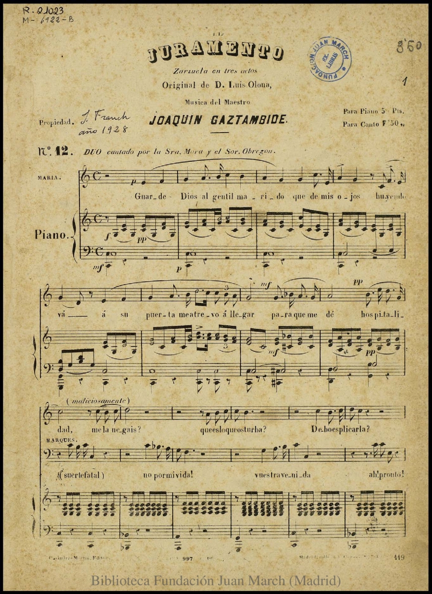 - Nota: Música para dos voces y piano.; Estreno: Teatro de la Zarzuela (Madrid), 20 de diciembre de 1858.; Fecha tomada de C. J. Gosálvez, La edición musical española hasta 1936.; Partitura encuadernada con una cartulina amarilla.; En la cabecera, nota manuscrita: "J. Franch año 1928"