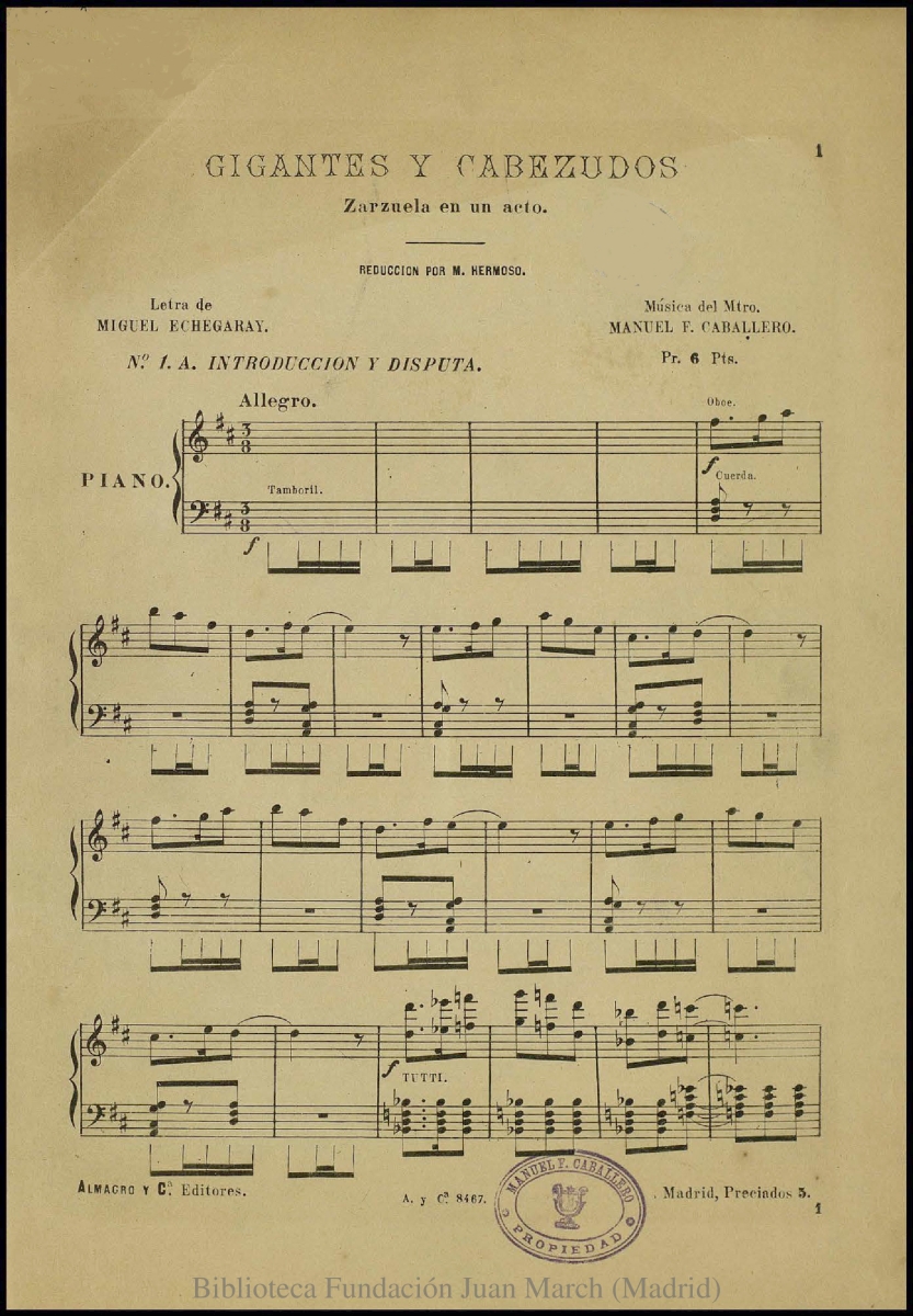 Nota: Música para voces solistas, coro y piano.; Estreno: Teatro de la Zarzuela (Madrid), 29 de noviembre de 1898.; Partitura apuntada, con la entrada de los instrumentos de orquesta y con la notación musical para tamboril.; Ecuadernada en cartón azul.; En p. 1, sello: "Manuel Caballero. Propiedad"