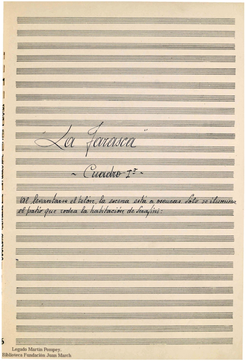 Música manuscrita.; Plantilla: voces solistas -- 2 2 2 2 -- 4 2 0 0 -- timb -- cuerda.; Personajes: La Tarasca, La Moza, La Dueña, Maestro Serafín, Don Sebastián, Un Viejo, Un Loro.; Al final de la partitura, firma, lugar y fecha de composición: "Madrid 31 de agosto de 1956 a las 6 [...] Angel Martín Pompey"; Legado Ángel Martín Pompey.