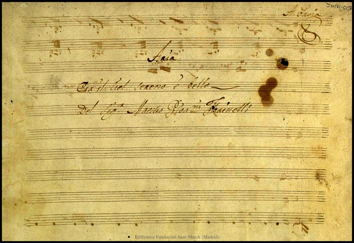 - Nota: Música manuscrita.; Plantilla: B, ob, fag, trp, cor, vl1, vl2, val, b. c.; En el margen superior derecho de la portada, posible propietario o empresario: "A. Pavias"; Colección de partituras manuscritas e impresas de los ss. XVIII-XX.