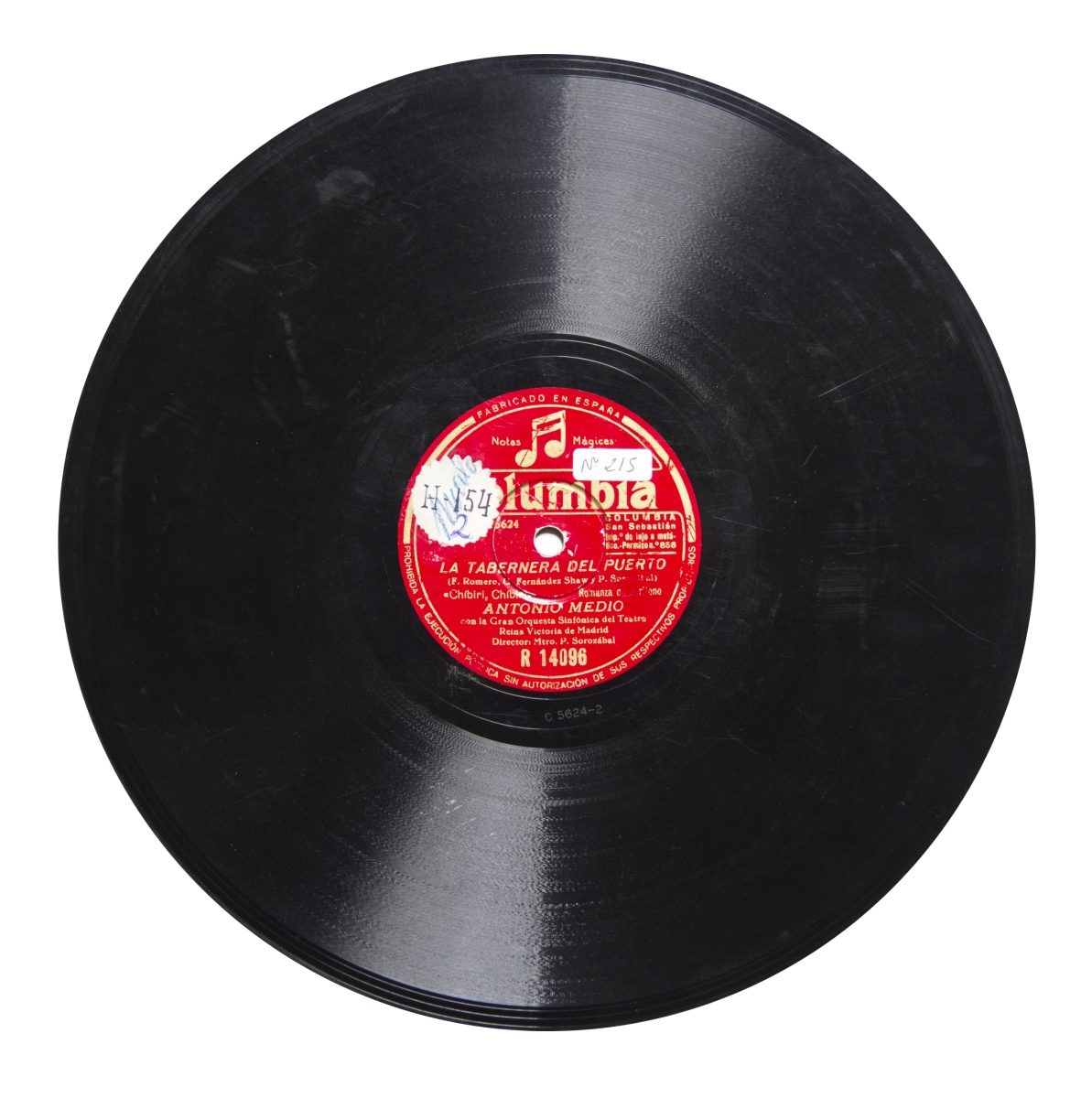 Música para barítono y orquesta (Chibirí, chibirí) y para soprano y orquesta (En un país de fábula); Etiqueta roja con logo "Doble Nota" y "Notas Mágicas" en dorado.; Sellos con numeración pegados en ambas caras: "H - 154". Escrita a mano la palabra "malo" en una pegatina en la cara B.; Recopilación de los discos "Columbia" publicados desde 1º de junio de 1942 hasta 30 de abril de 1944, p. 7; Recopilación de los discos "Columbia" publicados desde 1º de junio de 1942 hasta 30 de abril de 1944, p. 7