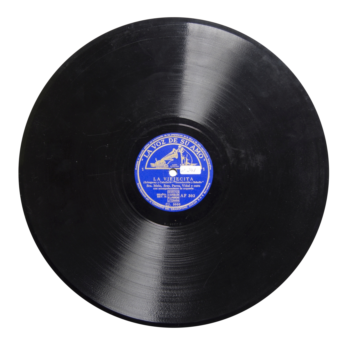 Nota: Música para cuarteto vocal y orquesta.; Etiqueta azul con el logo azul y dorado de La voz de su amo.; En la etiqueta, en letras doradas: "ESPAÑOL", "REV. 78"; Estreno: Teatro de la Zarzuela (Madrid), el 30 de marzo de 1897.; Sellos de derechos de reproducción pegados en las etiquetas de ambas caras.