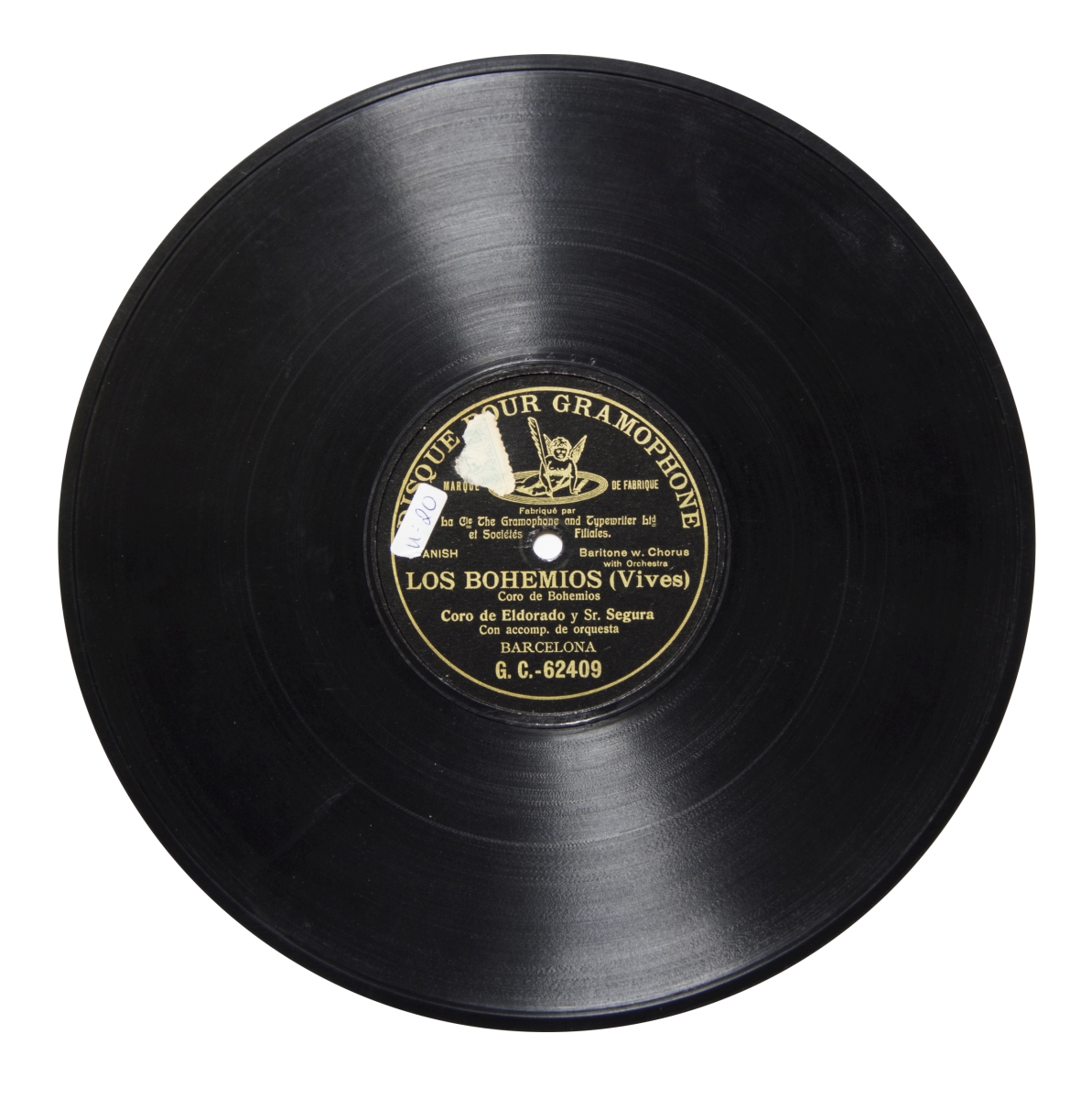 Música para voz, coro y orquesta.; Etiqueta negra con el logo en color dorado (querubín sosteniendo una aguja sobre un disco). Inscripciones: "Disque pour gramophone", "Fabriqué par La Cie. The Gramophone and Typewriter Ltd. et Sociétes Filiales", "SPANISH", "Baritone w. Chorus with Orchestra", "Barcelona"; Disco grabado en una única cara.; Estreno: Teatro de la Zarzuela la noche del 24 de marzo de 1904.