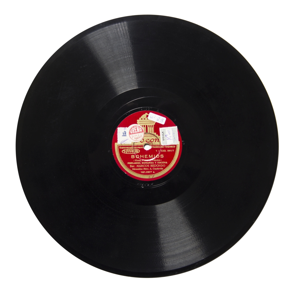 Música para voces solistas, coro y orquesta.; La Canción Bohemia está incompleta.; Etiqueta roja con logo "Odeon" dorado. Letras e inscripciones doradas en ambas etiquetas.; El disco nº 3 (D78RPM-25) está fragmentado. Fragmento: 3 x 15,3 cm.; Timbres en todas las etiquetas de los discos, con la siguiente inscripción: "SIDOLA. Derechos de reproducción fonográfica pagados [firma de Vives]", timbre con fondo blanco, logo de Odeon en azul y la firma "MRedondo", sello del distribuidor en colores rojo y blanco con la siguiente inscripción: "Ureña. Prim, 1. Madrid"; Fecha de publicación basada en el sistema de grabación eléctrico "Veroton", utilizado por Transoceanic Trading Cº durante los años 1928-1932.; Estreno (Bohemios): Teatro de la Zarzuela la noche del 24 de marzo de 1904.; Estreno (Don Lucas del Cigarral): Teatro de París el 18 de febrero de 1899.; En la etiqueta, indicación del sistema de grabación eléctrica "Veroton"