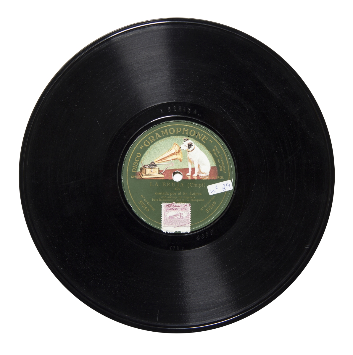 Música para voz y orquesta.; Duración: 3'06"; Etiqueta verde con el logo "La Voz de su Amo". Inscripciones en letras doradas: "SPANISH", "TENOR W. ORCH"; La cara B no está grabada.; Sello-timbre de color violeta con la inscrición: "Derechos pagados al autor" y la firma de Vives sobre otras palabras ilegibles.