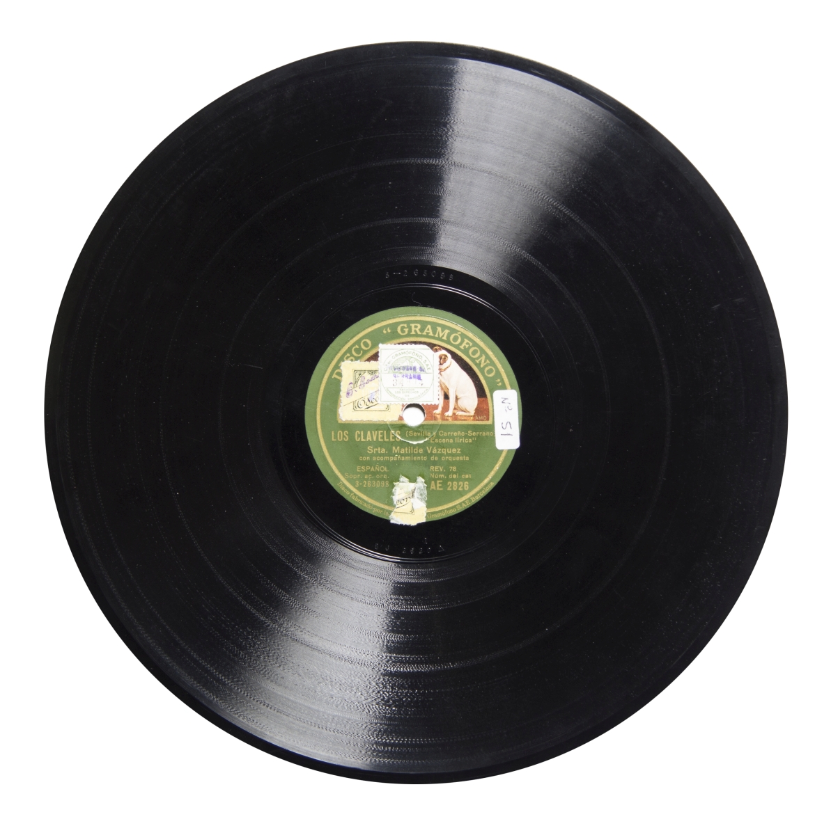 Música para voz (soprano) y orquesta.; Duración: 3'53" (Escena lírica), 3'30" (Mujeres). Total: 5'23"; Cara A: etiqueta verde con el logo de La Voz de su Amo y letras doradas con las siguientes inscripciones: "Disco Gramófono", "La Voz de su Amo", "Disco fabricado por la [Compañía del] Gramófono S.A.E. Barcelona", "ESPAÑOL", "Sopr. ac. orq.", "REV. 78", "Núm. del cat. AE 2826"-- Cara B: las mismas excepto: "tenor ac. orq"; Fecha de publicación tomada del catálogo online de la BNE.; Sello-timbre en color verde y blanco con el logo de La Voz de su Amo y la inscripción: "Cía. del Gramófono S.A.E. Pagados los derechos de reproducción fonográfica. 34804" y firma "SERRANO"; sello-timbre con la palabra Odeón en verde sobre fondo blanco-amarillento y firma ilegible; restos de sello con la palabra Odeón. En ambas caras del disco.; Catálogo general de discos marca "La Voz de su Amo", julio de 1930, p. 141; Catálogo general de discos marca "La Voz de su Amo", julio de 1930, p. 141