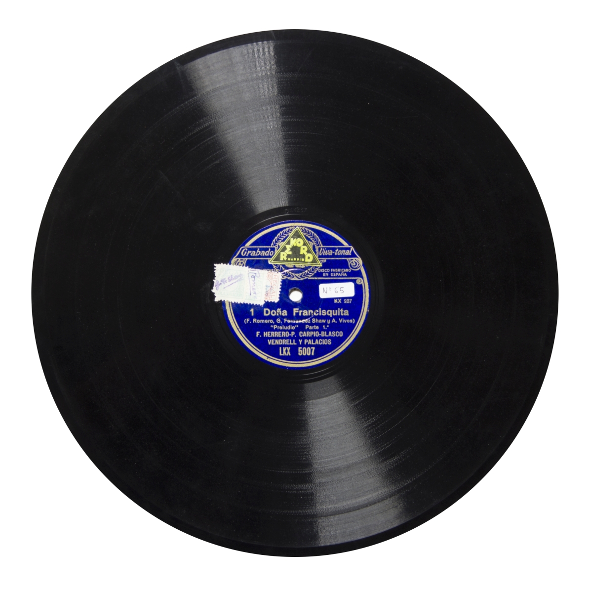 Música para solistas, coro y orquesta.; Etiqueta azul con el logo de Regal y letras en dorado con las siguientes inscripciones: "Grabado en viva-tonal", "78 revoluciones por minuto", "Disco fabricado en España"; Estreno: Teatro Apolo de Madrid el 17 de Octubre de 1923, con libreto de Federico Romero y Guillermo Fernández Shaw.; Sellos-timbre de pagos de derechos fonográficos con firmas ilegibles; pegatina de "Rekord Madrid", "Rekord. Pi y Margall, 22. Tel. 18888. Madrid"