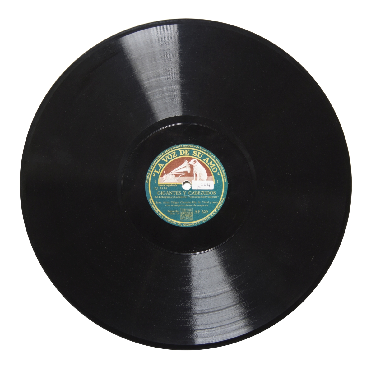 Música para voces solistas, coro y orquesta.; Etiqueta verde (en cuatro tonos distintos) con el logo de La Voz de su Amo, letras doradas y las siguientes inscripciones: "La Voz de su Amo", "Marca Registrada. La Voz de su Amo", "Prohibida la ejecución pública sin autorización de los propietarios de la obra y de esta producción fonográfica", "Disco fabricado por la Compañía del Gramófono ODEÓN S.A.E. Barcelona", "Zarzuelas", "Rev. 78", "Derechos a disposición de la propiedad intelectual"; Estreno: Teatro de la Zarzuela en la noche del miércoles 29 de noviembre de 1898.; Cara 3: 2 sellos-timbre de color verde y blanco con el logo de La Voz de su Amo, la inscripción "Cía del Gramófono S.A.E. Pagados los derechos de reproducción fonográfica", "Derechos a disposición de la propiedad literaria" y las firmas de Echegaray y Herederos de Caballero -- Cara 4: los mismos.