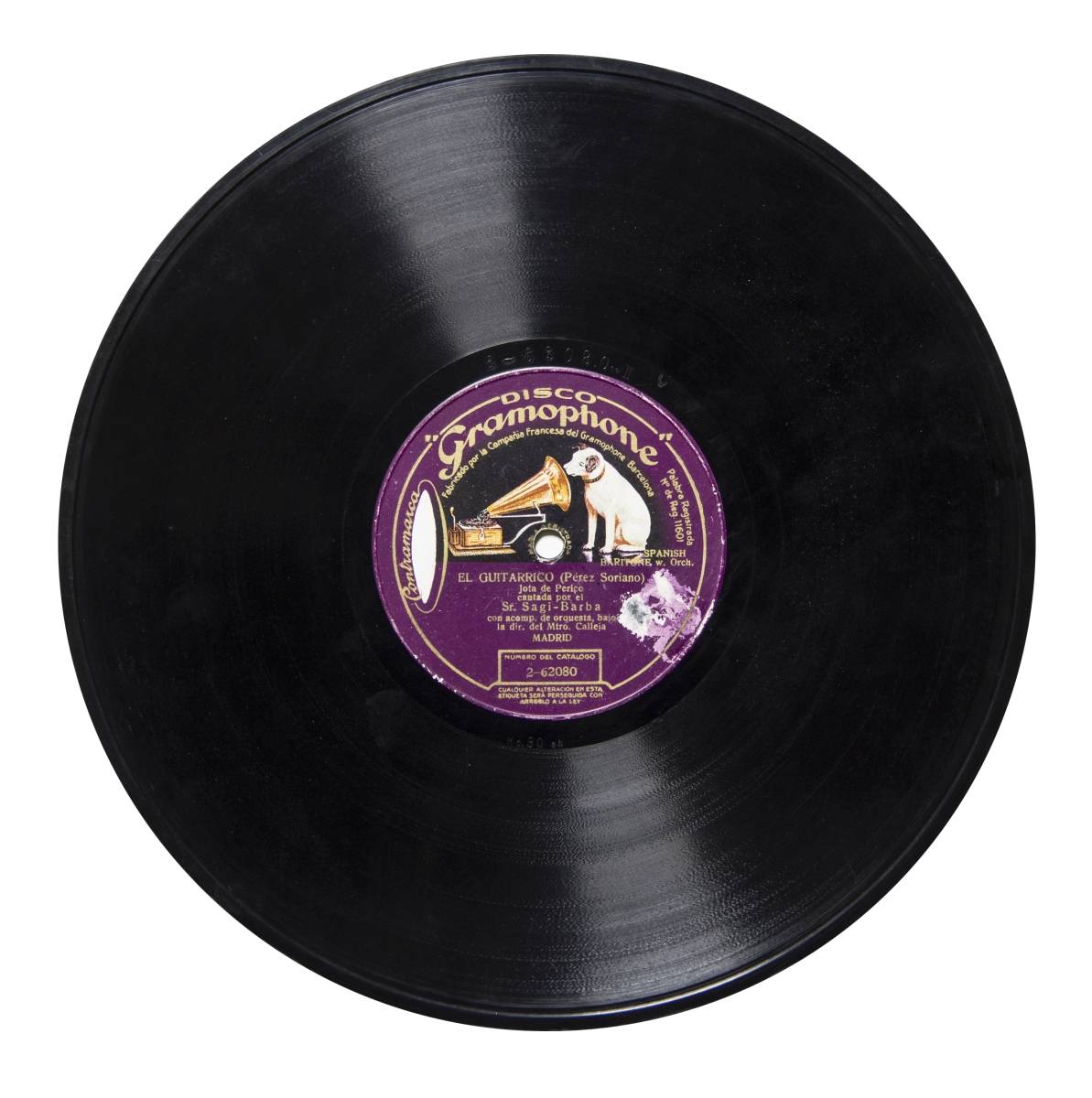 Etiqueta violeta con el logo de "La Voz de su Amo" y letras doradas con las siguientes inscripciones: "Disco Gramophone", "Palabra registrada. Nº de Reg. 11601", "Fabricado por la Compañía Francesa del Gramophone Barcelona", "Contramarca 2266", "Cualquier alteración en esta etiqueta será perseguida con arreglo a la Ley", "SPANISH", "Baritone and Ch. w. Orch.", "Baritone w. Orch"