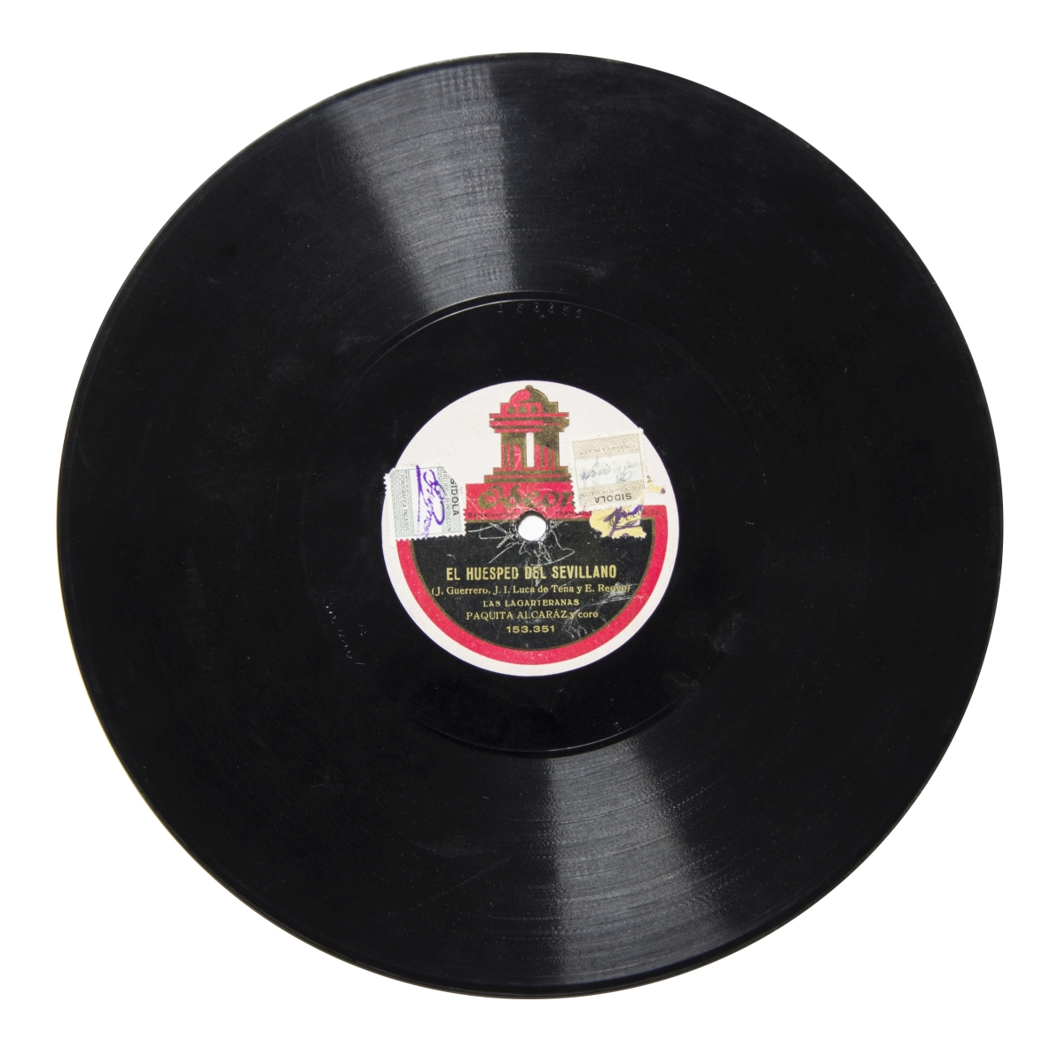 Cara A: 3 sellos-timbre, dos de color marrón y blanco y otro verde y blanco, con la inscripción: "Cía. del Gramófono S.A.E. Pagados los derechos de reproducción fonográfica" y las firmas de "Romero" y otras dos ilegibles; sello de distribuidor de color blanco y forma redonda con un dibujo del mundo en verde, con la inscripción: " Aeolian. Pianos y pianolas. Conde Peñalver, 24. Madrid)